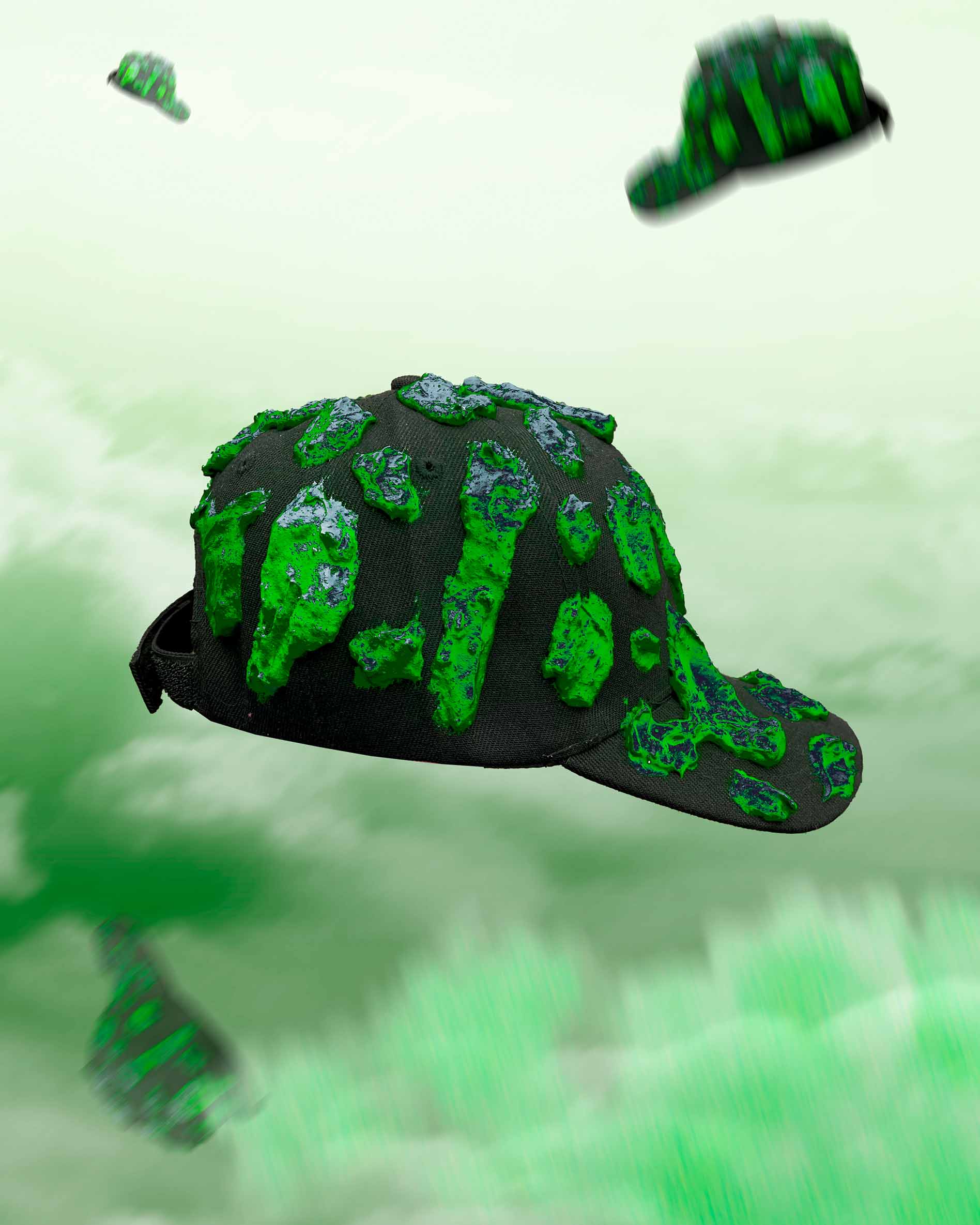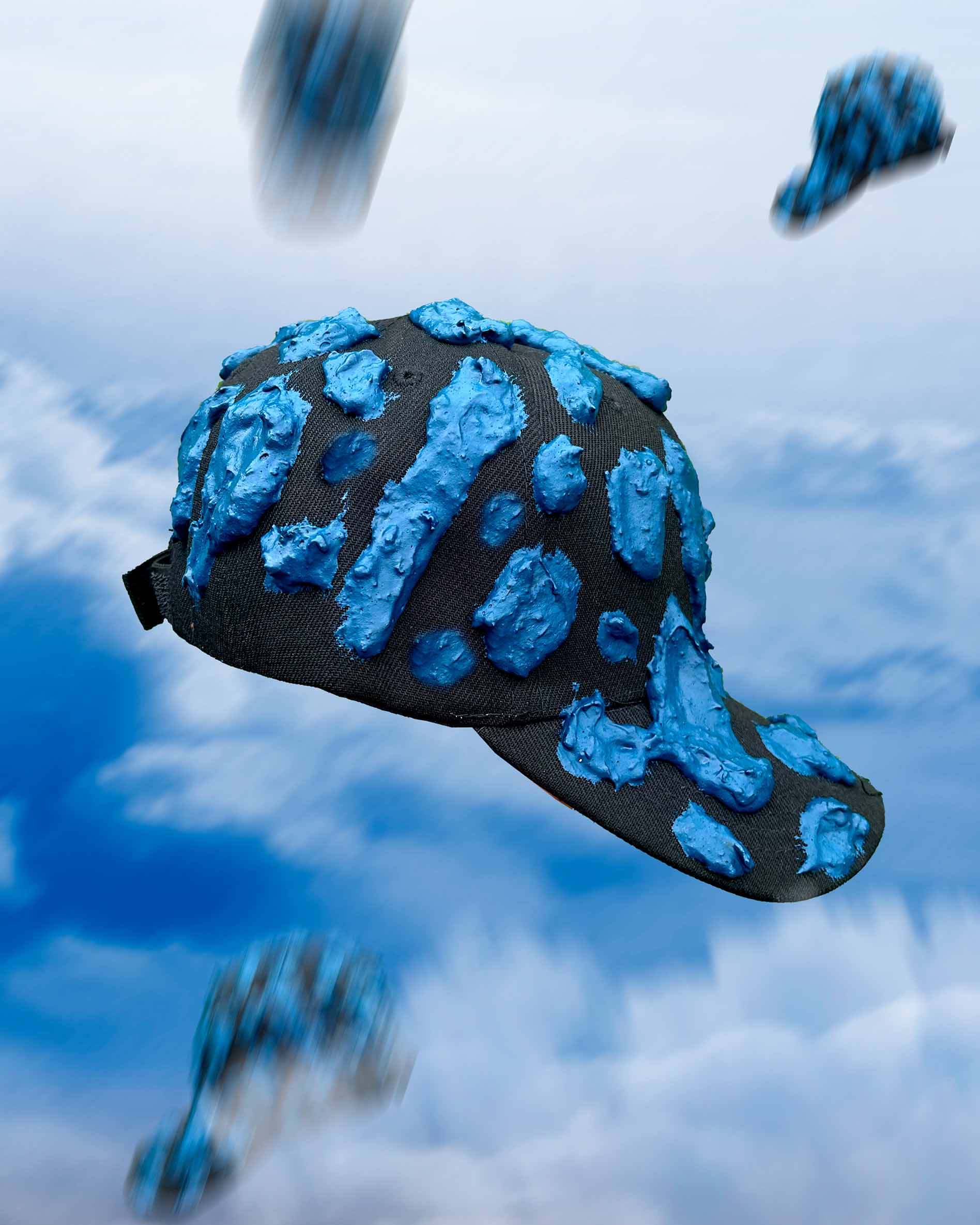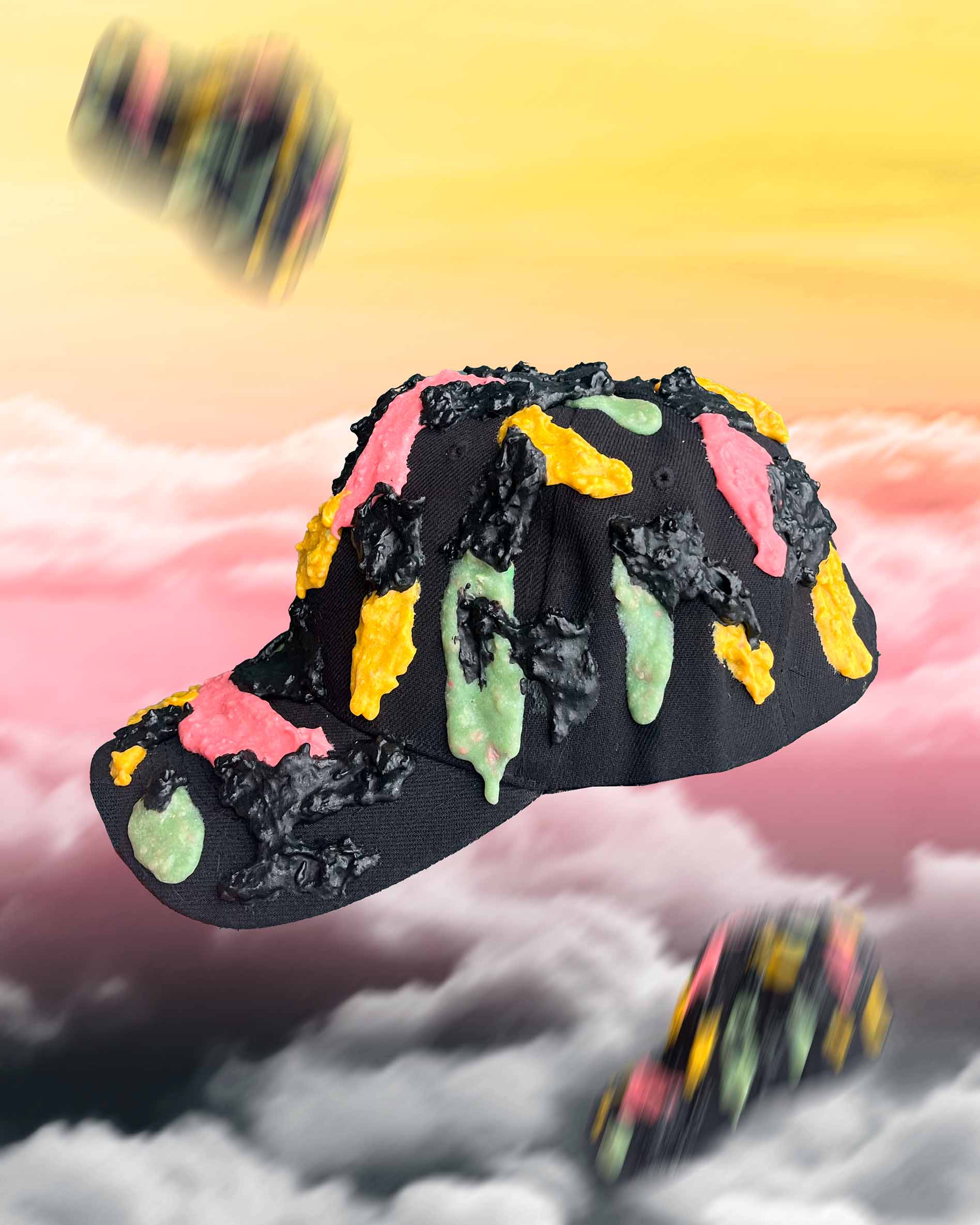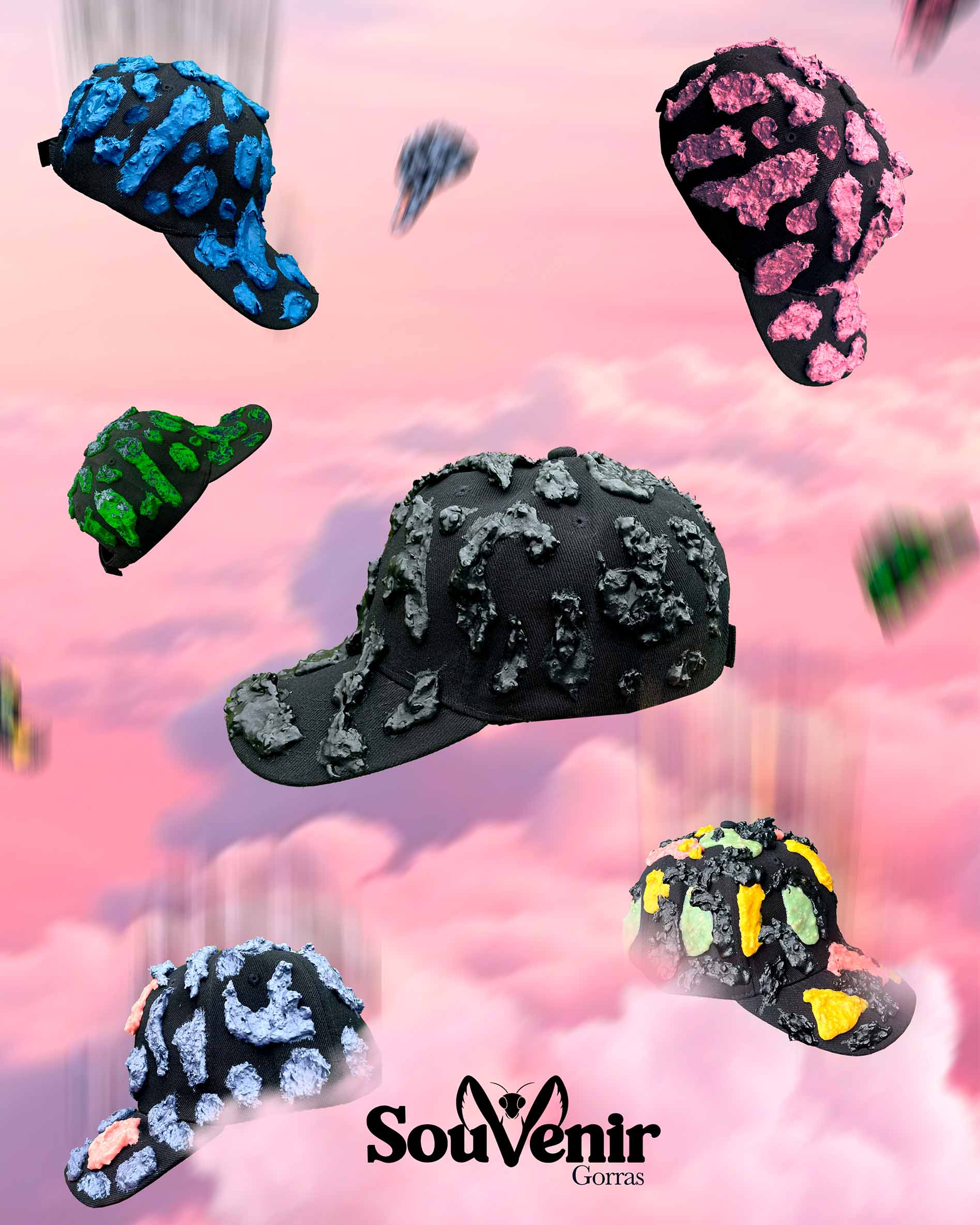 El primer ítem de la nueva colección Verano 2026 – Souvenir son estas gorras intervenidas con la misma textura de la pieza de arte textil Mantis Centinela 🎭🎨