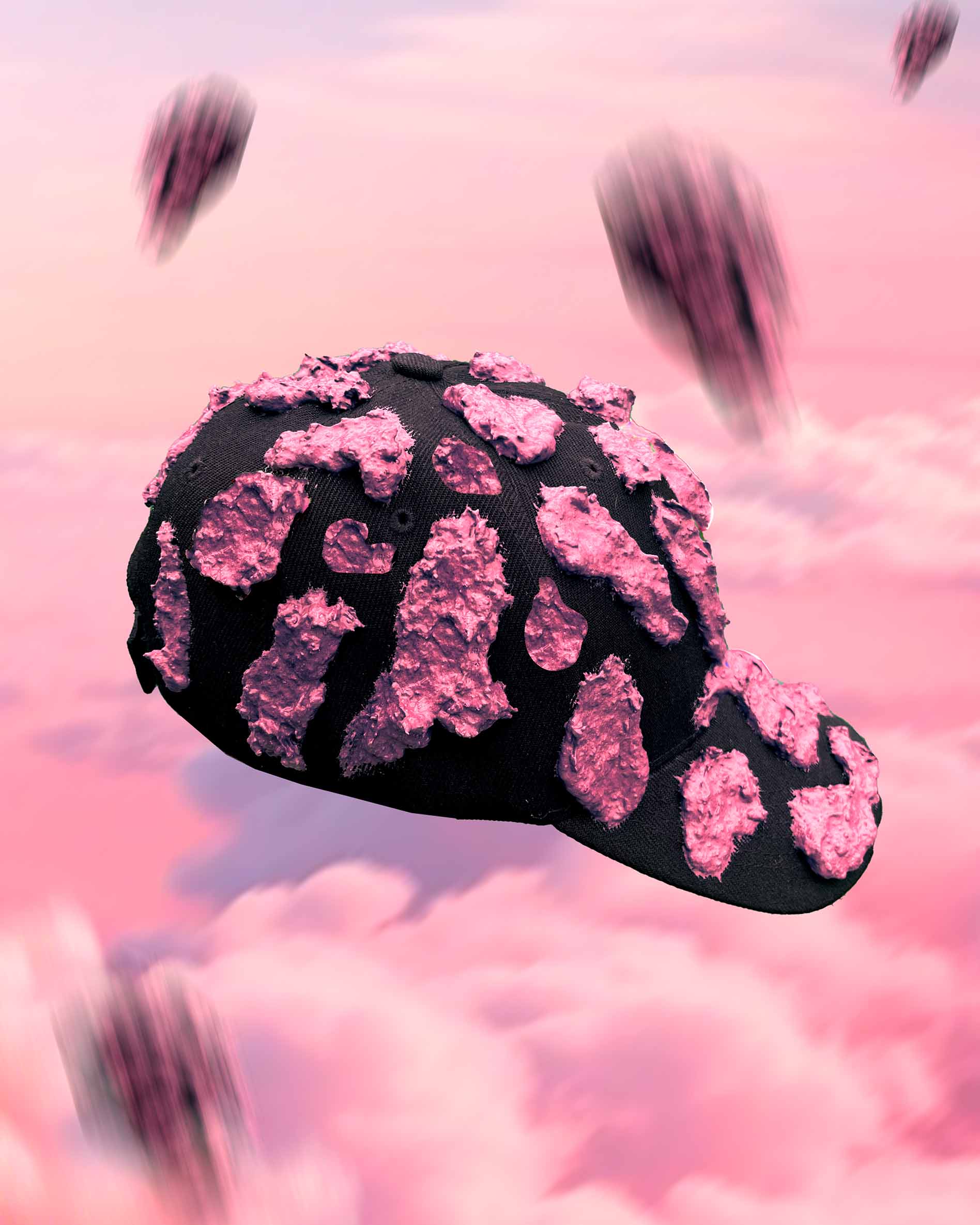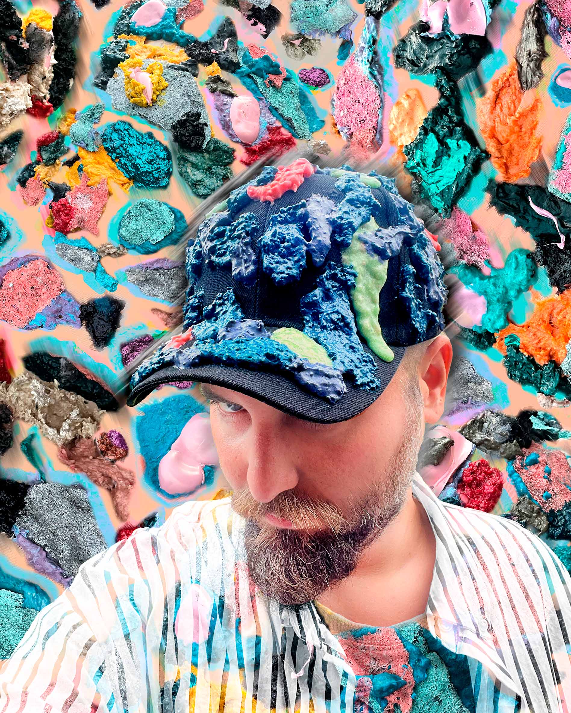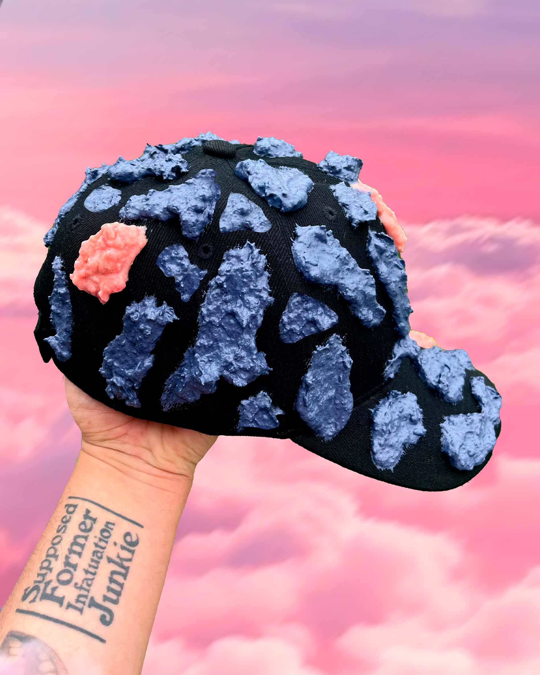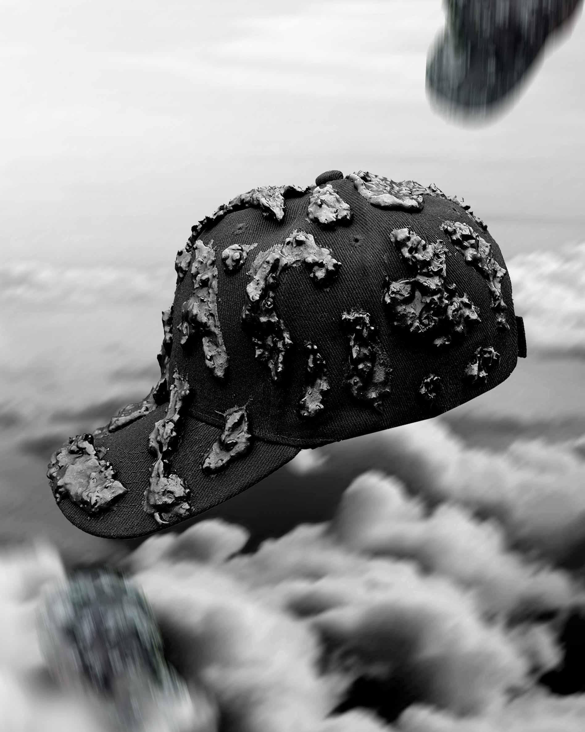 El primer ítem de la nueva colección Verano 2026 – Souvenir son estas gorras intervenidas con la misma textura de la pieza de arte textil Mantis Centinela 🎭🎨