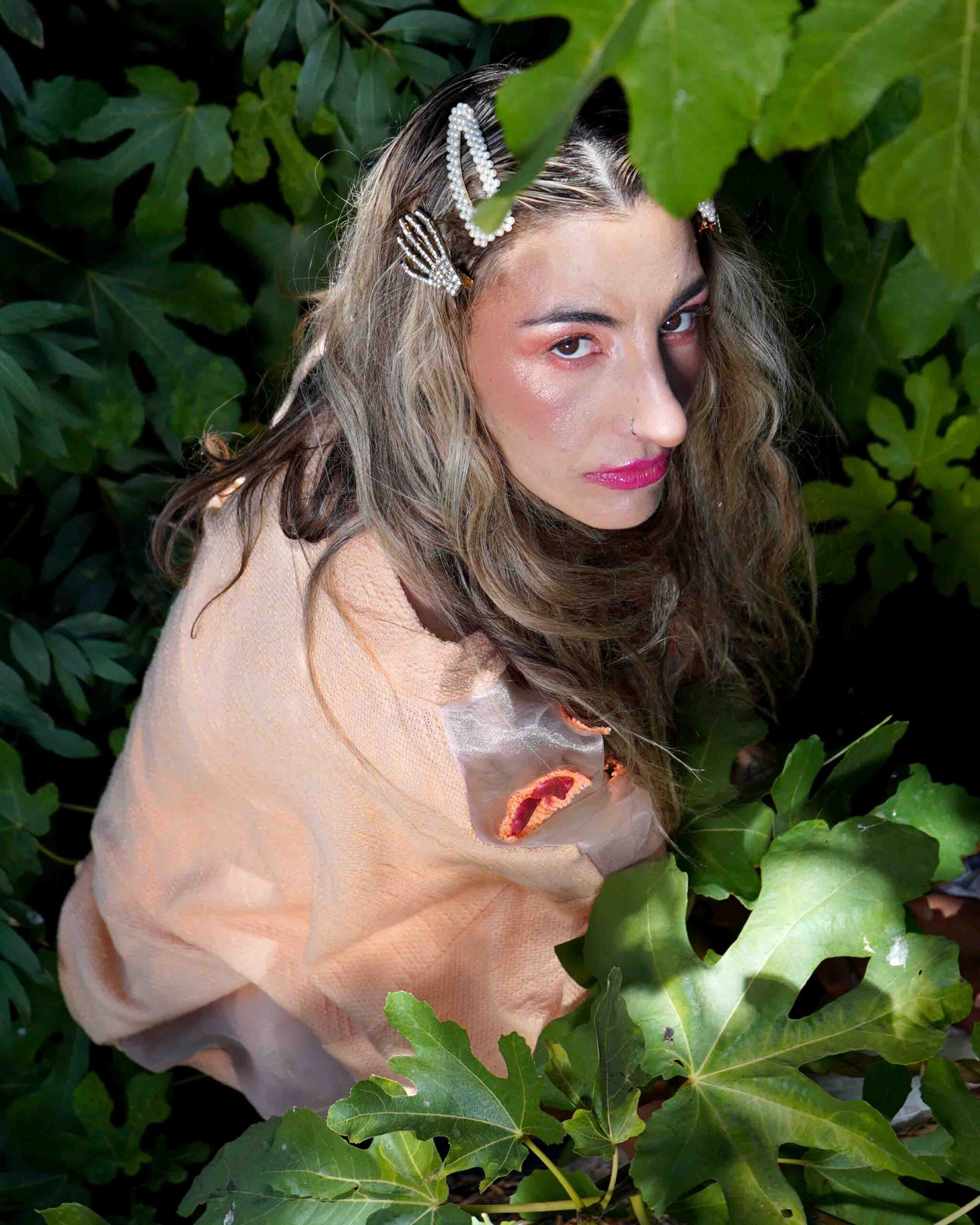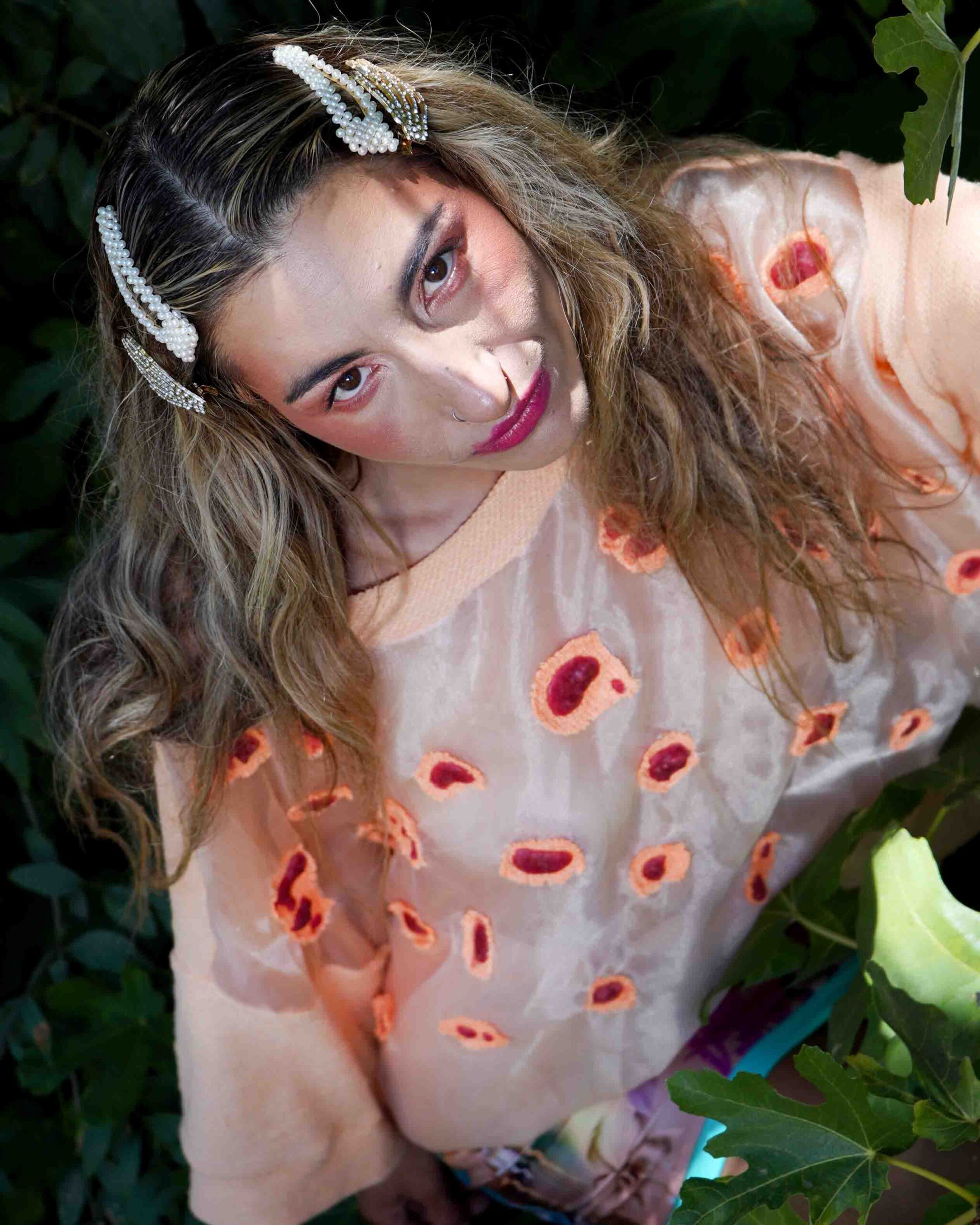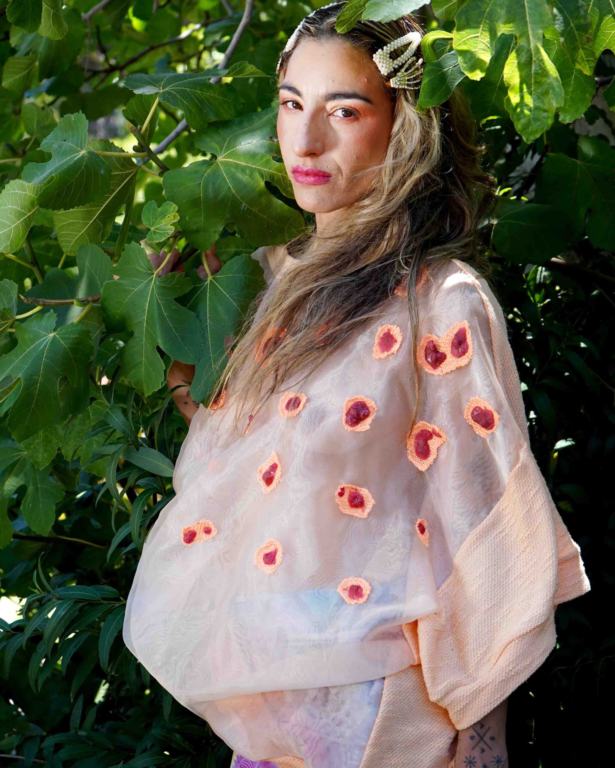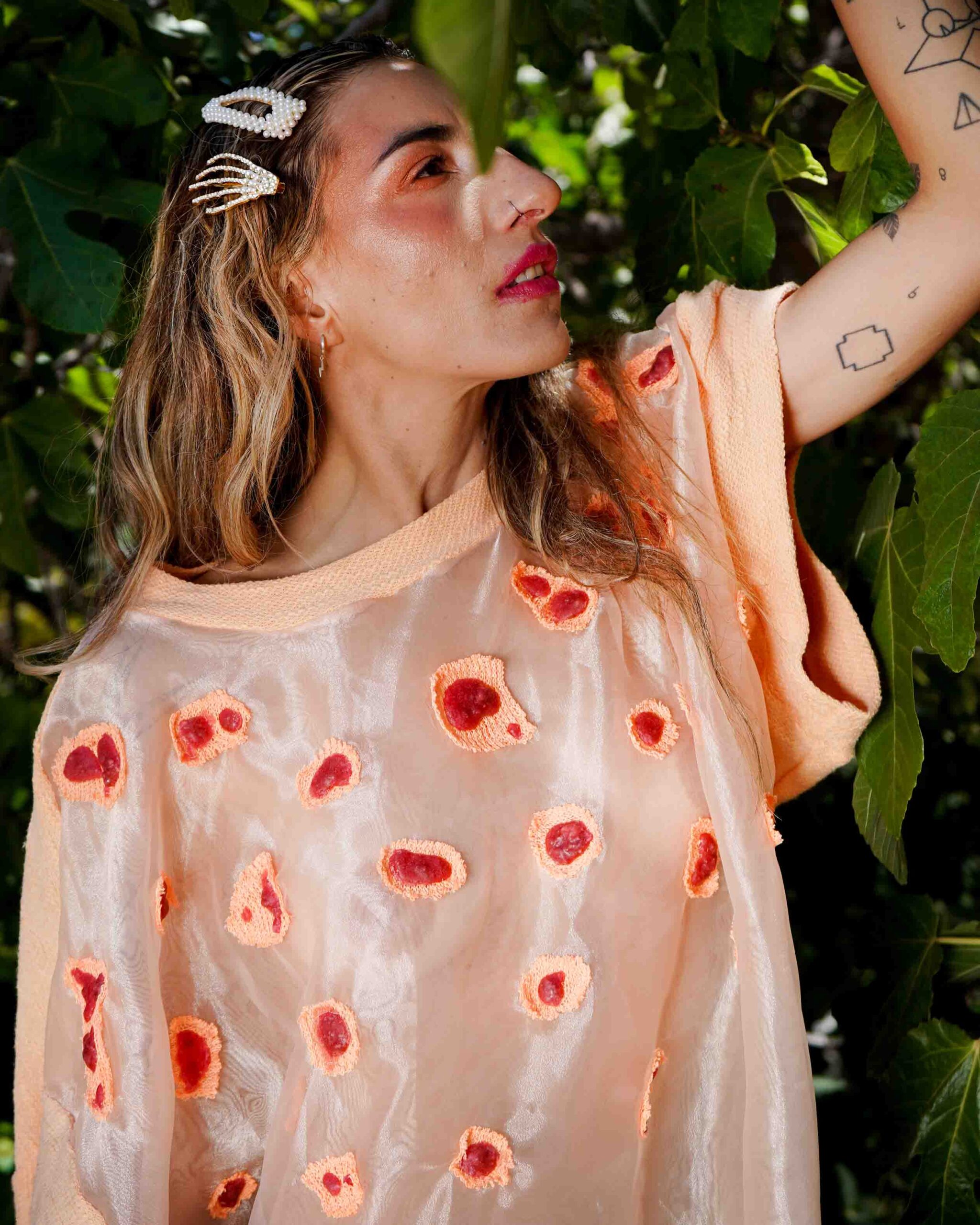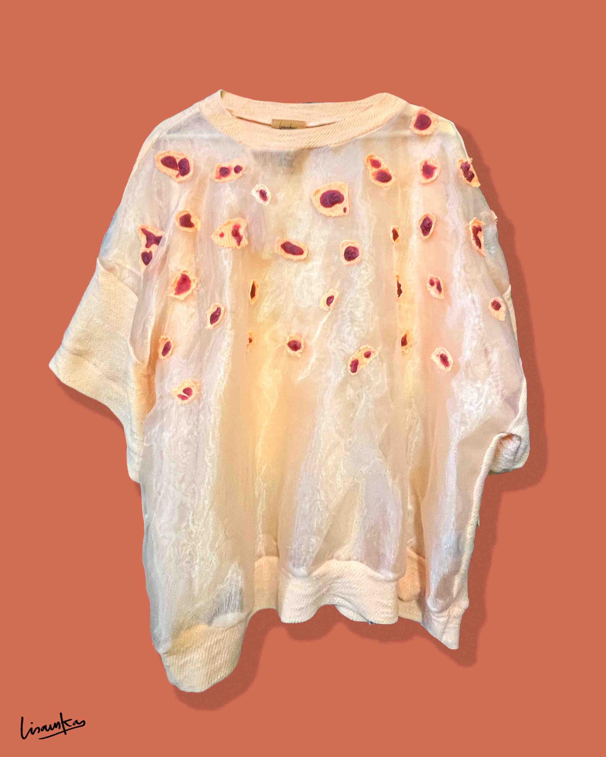 Maxi sweater oversize, talla única, confeccionado en una mezcla de texturas. El frente combina organza color durazno claro con una base de lanilla naranja, intervenida con detalles de pinturas con volúmen plasma texturizada y una doble capa de organza que aporta transparencia y profundidad.