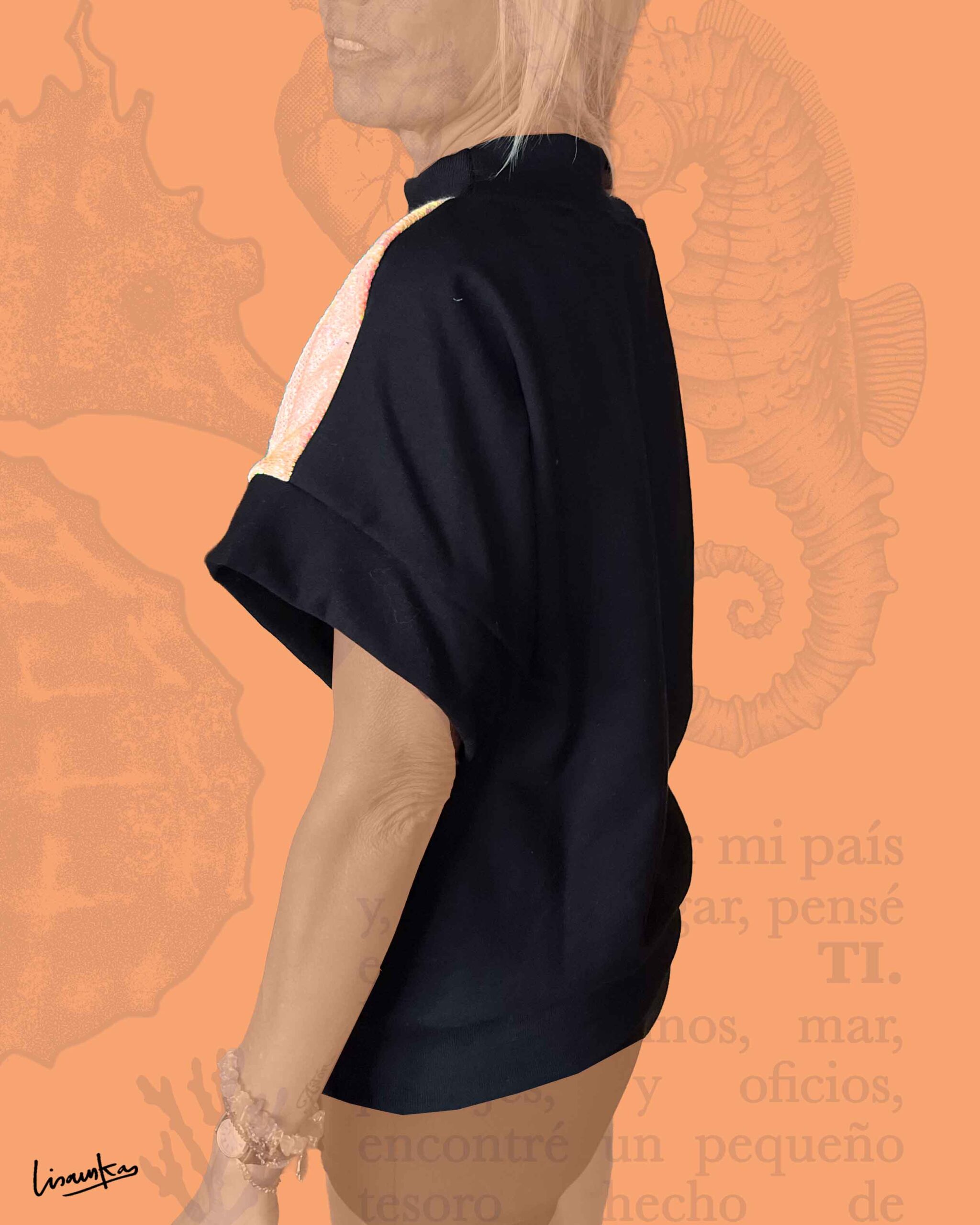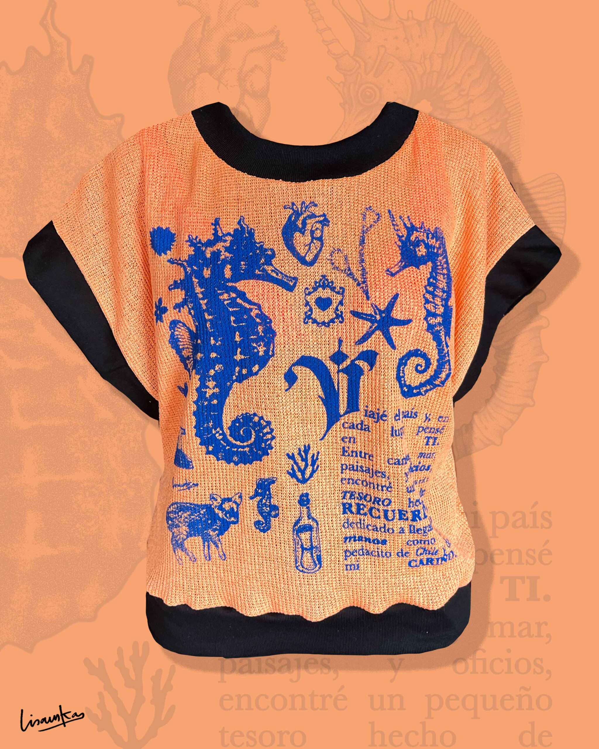 Polerón sin mangas con frente de lanilla naranja y serigrafía de estampa propia en azul klein. La espalda y las mangas están confeccionadas en algodón franela nacional negro, generando un contraste limpio y cómodo.