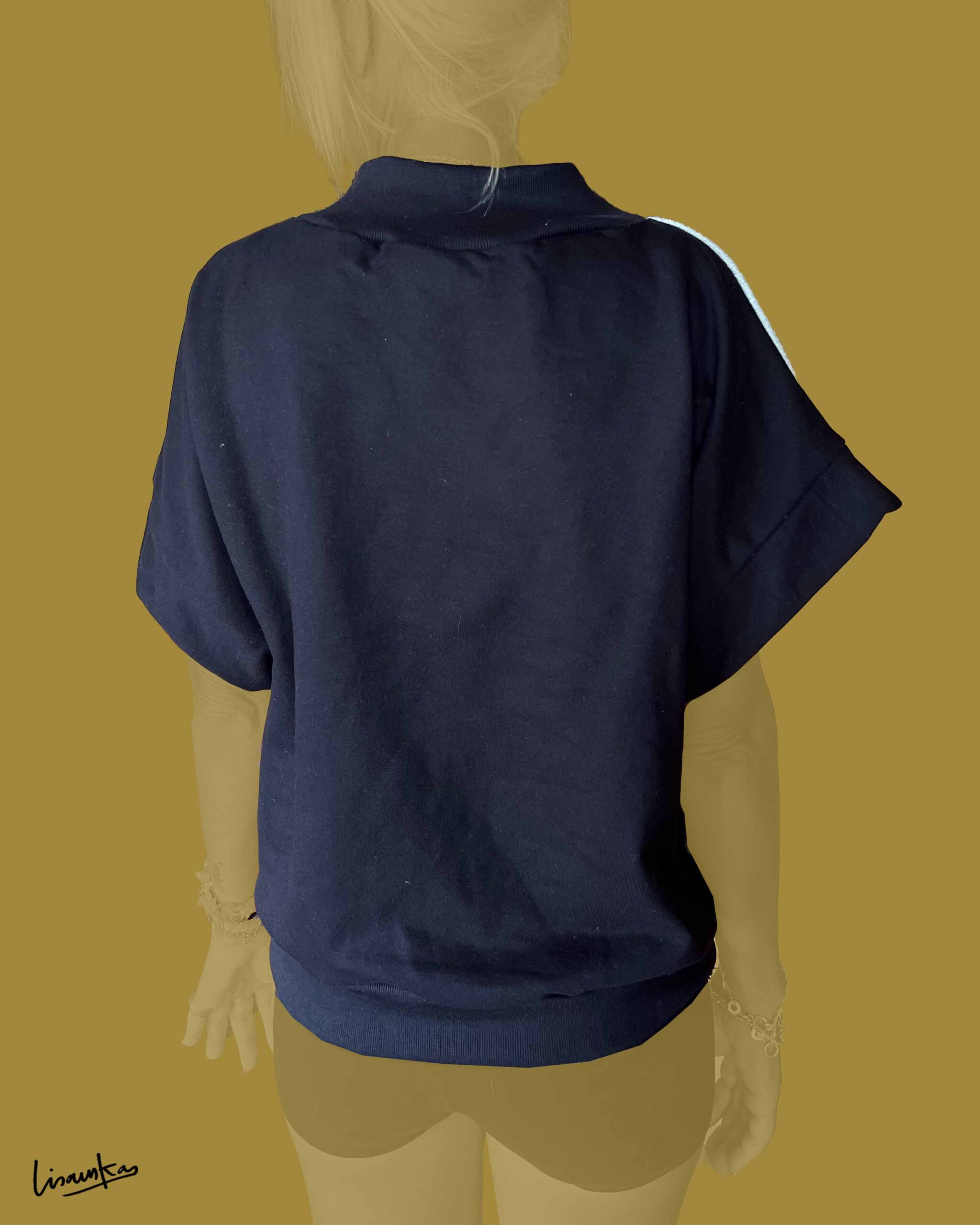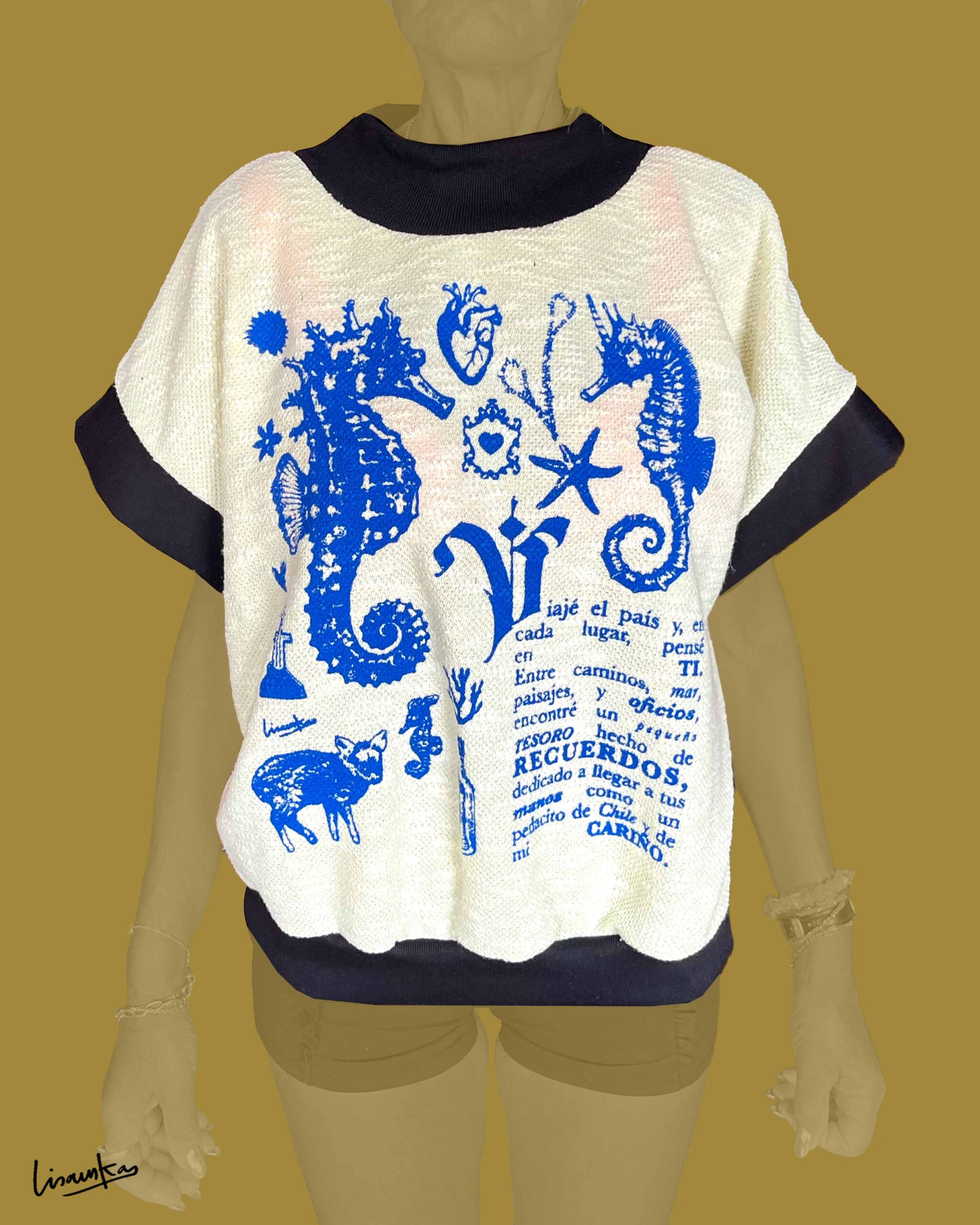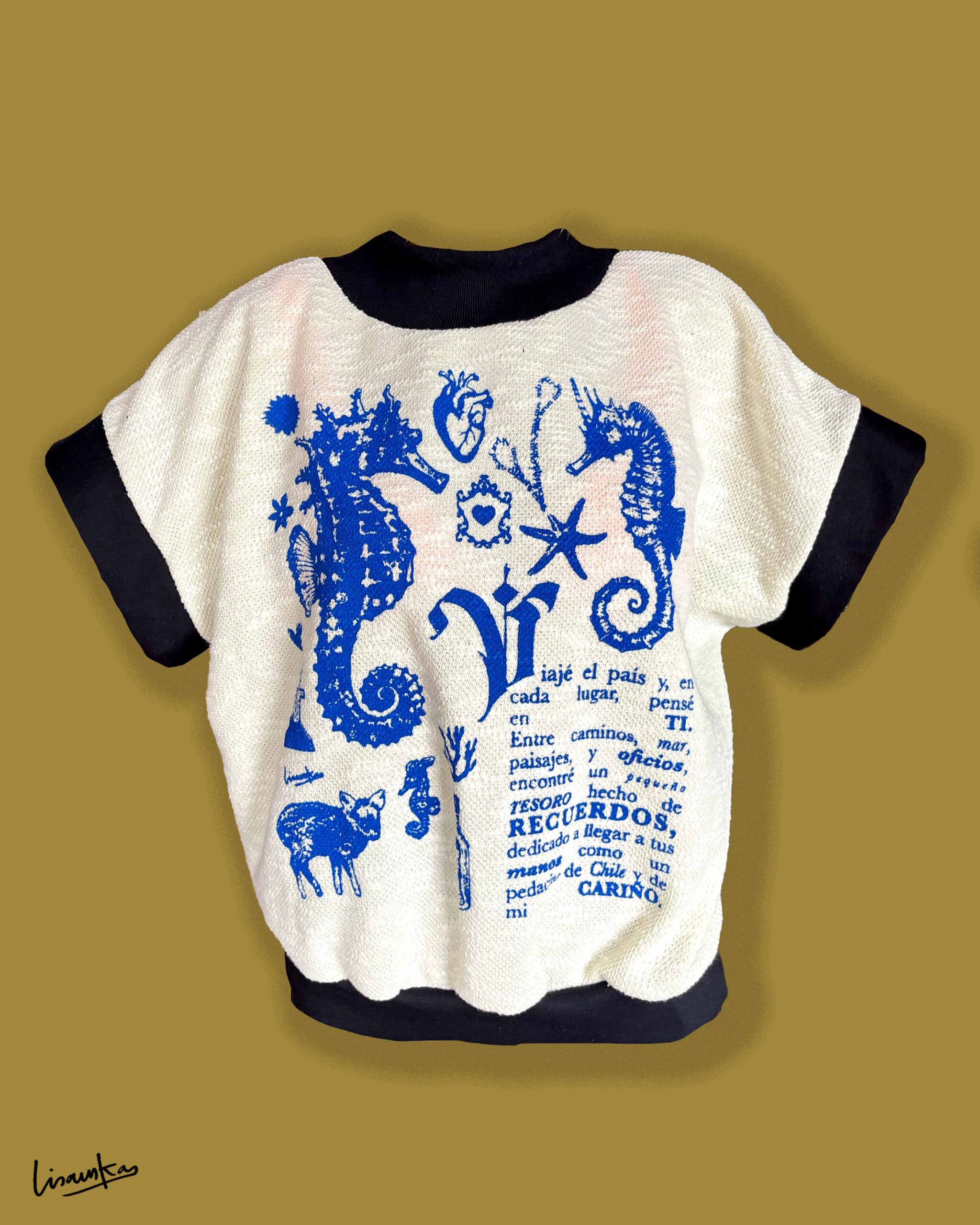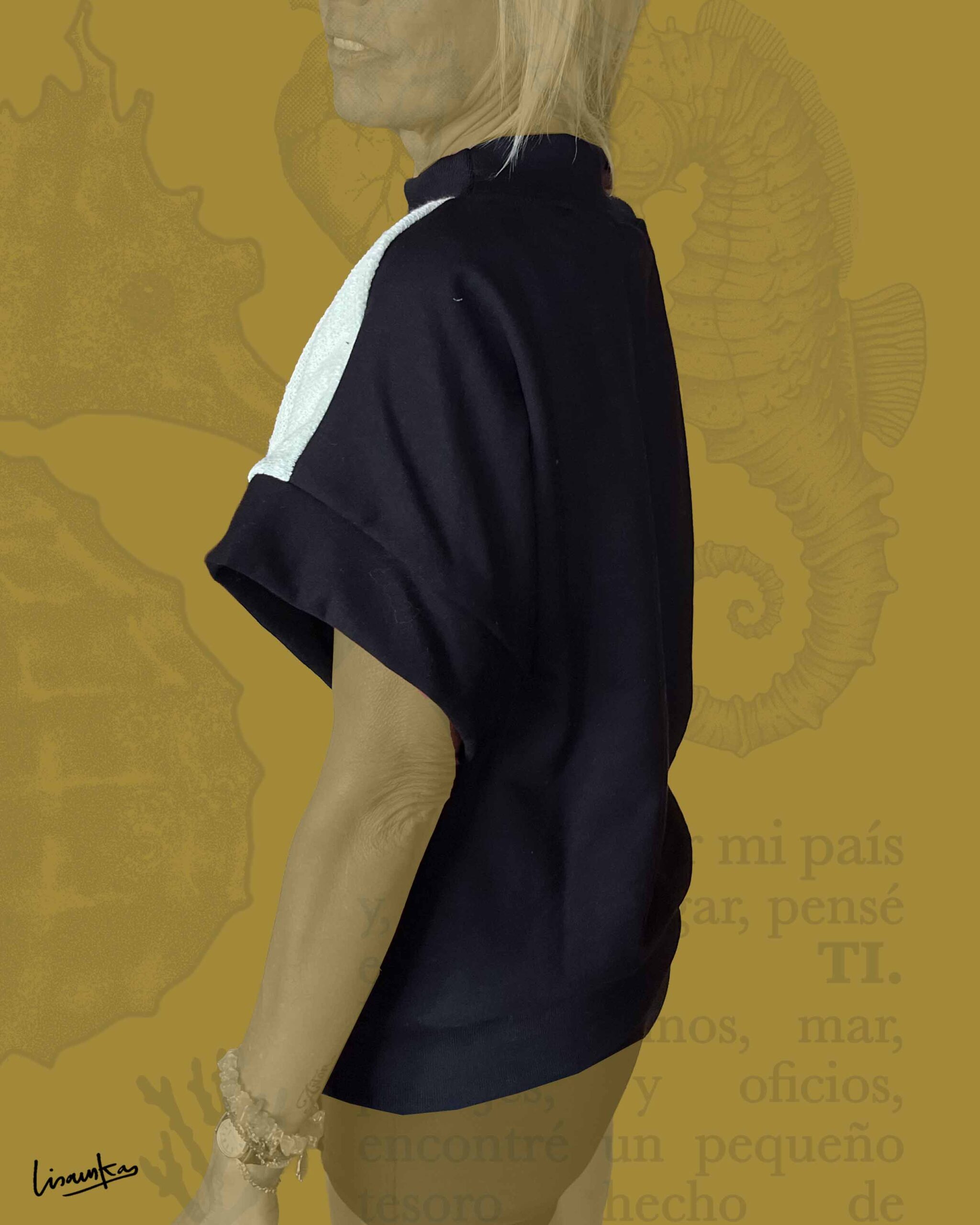 Polerón sin mangas con frente de lanilla amarillo claro y serigrafía de estampa propia en azul klein. La espalda y las mangas están confeccionadas en algodón franela nacional negro, generando un contraste limpio y cómodo.