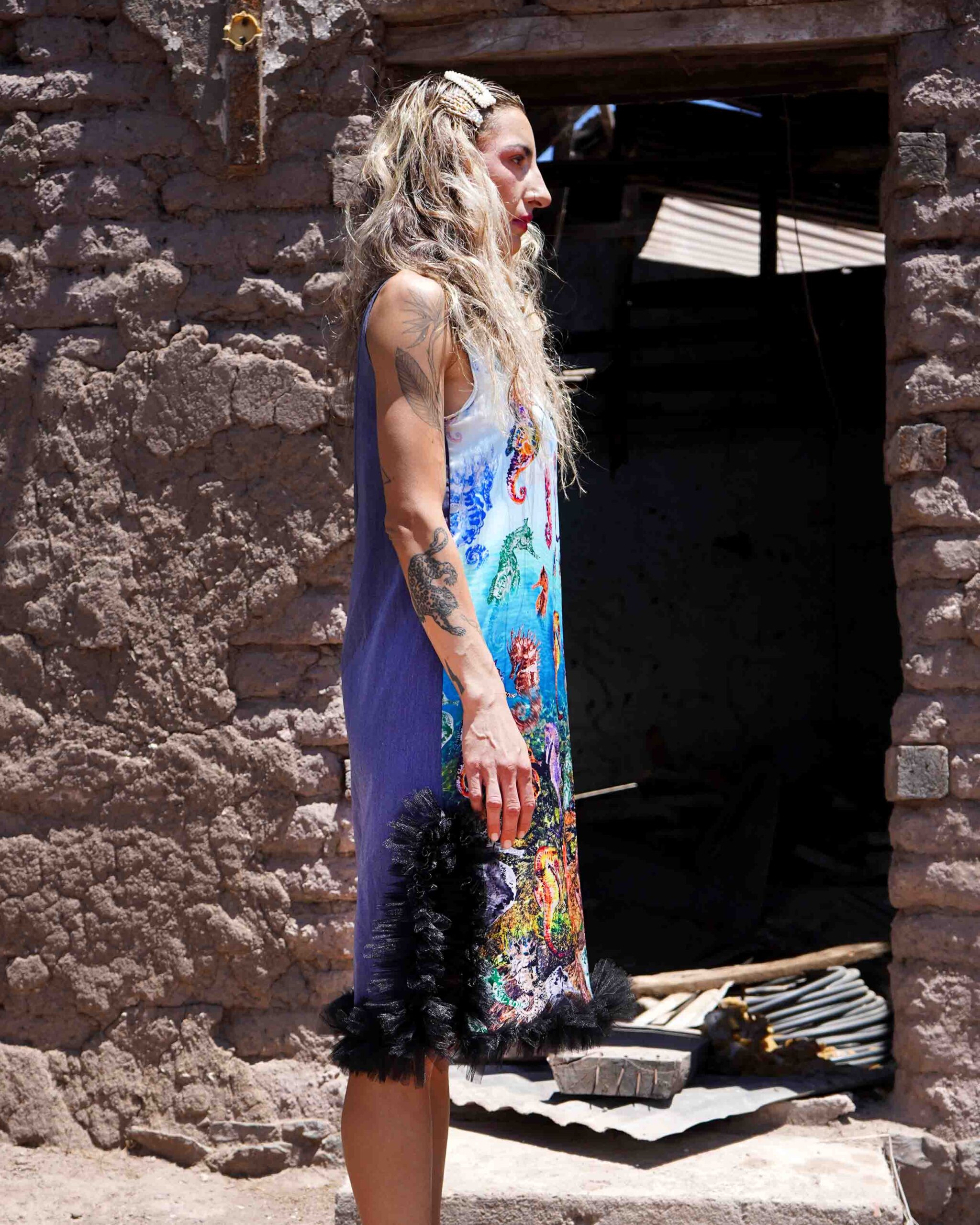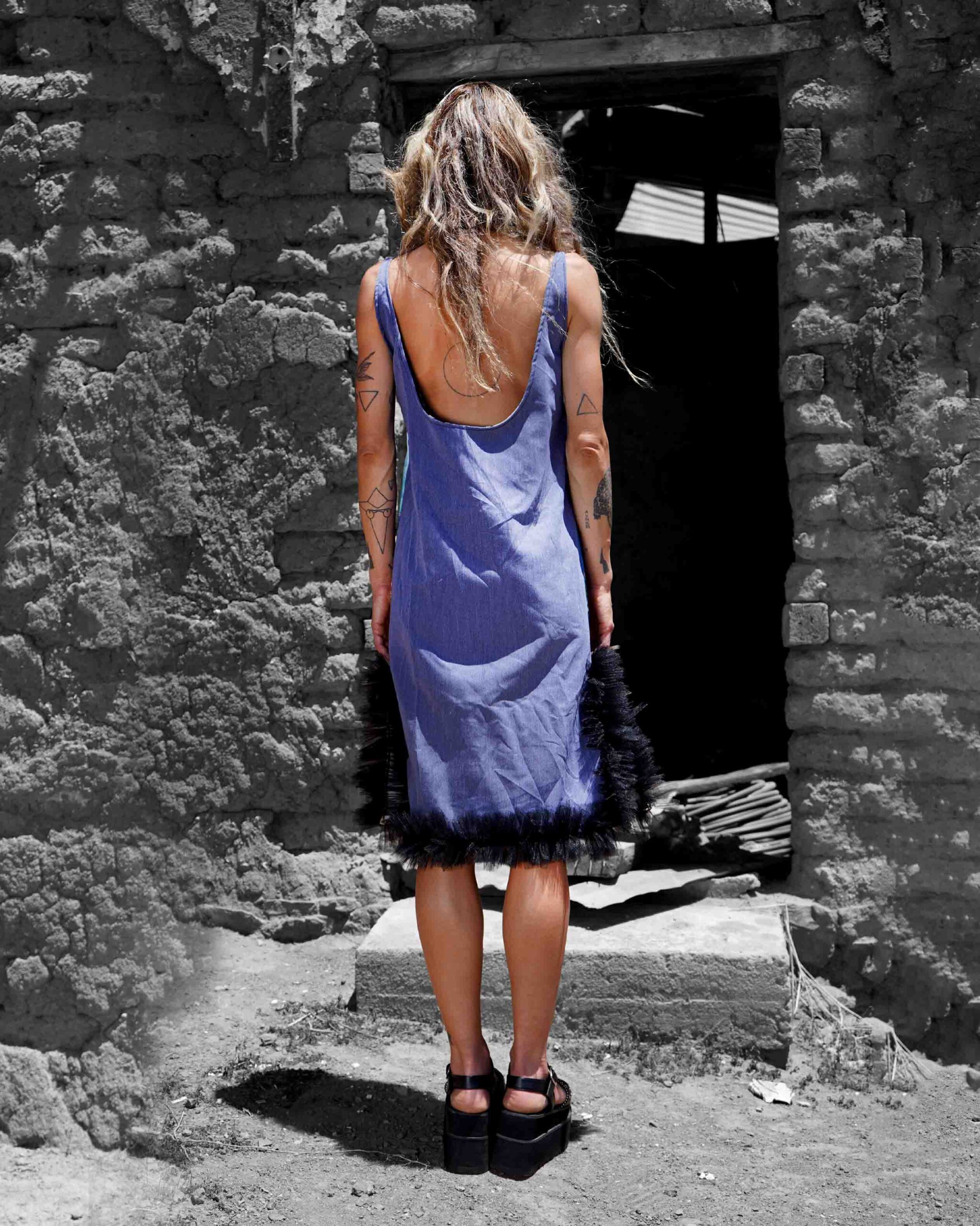 Tiene tiras delgadas y está completamente forrado en gasa negra, lo que aporta movimiento y ligereza. La espalda, en denim delgado de algodón, suma contraste y estructura, mientras que los tajos laterales terminan en vuelos de tul negro que acompañan el caminar.