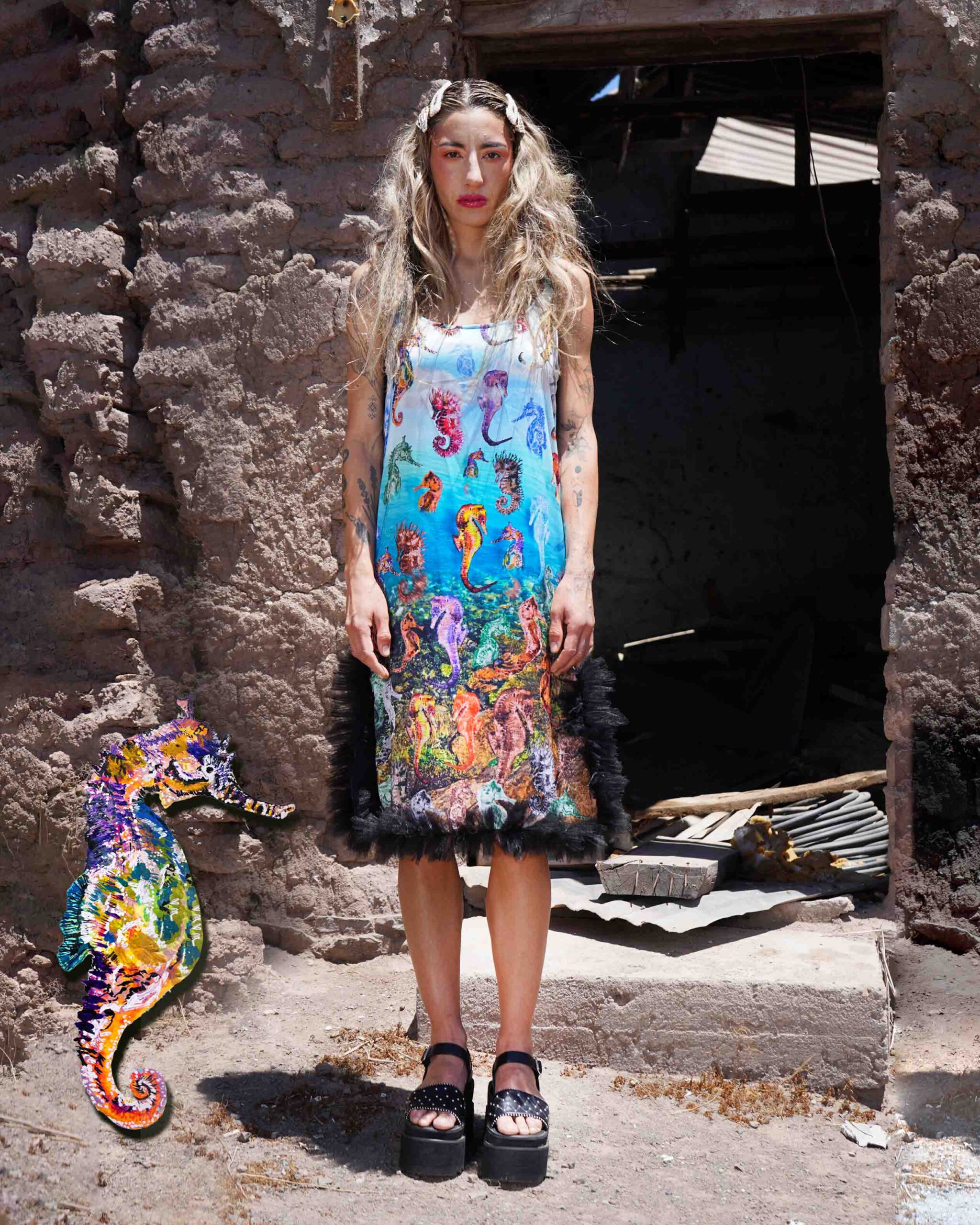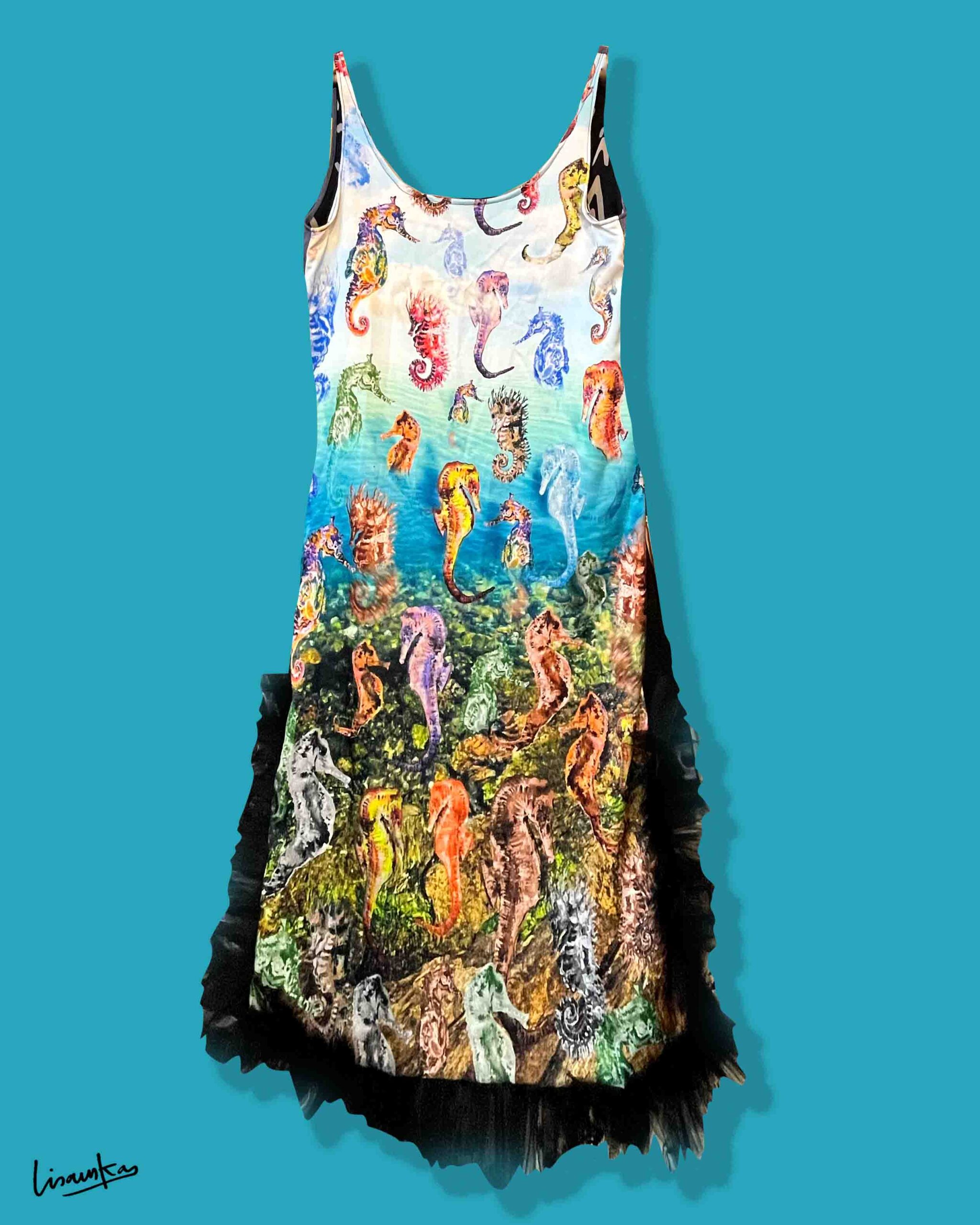 Vestido sin mangas con frente en satín reciclado elaborado a partir de botellas PET, intervenido con nuestra estampa original de caballitos de mar, pintados en acuarela y desarrollados en rapport sobre un fondo marino.